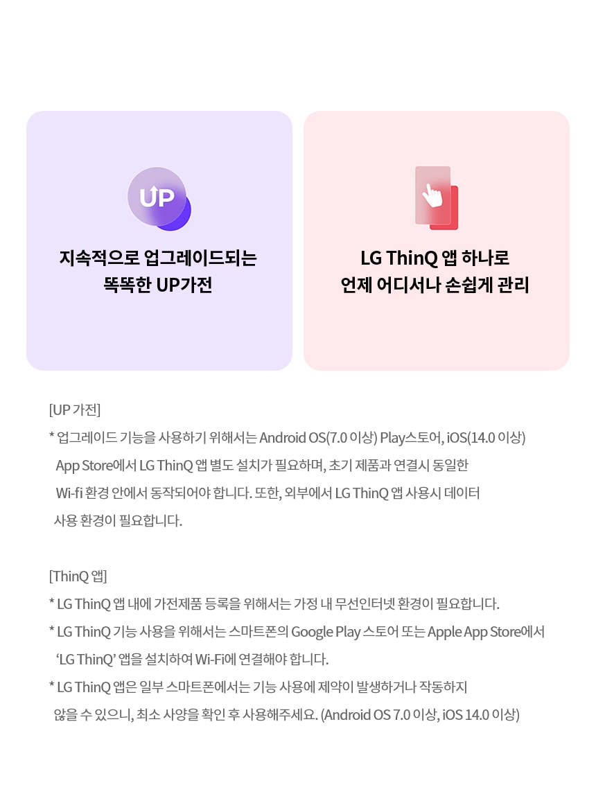 ※ 총 계약기간 동안 상품의 소유권은 'LG전자'에게 있습니다.※ 분실료 기준 : 상품 판매가-{(상품판매가÷72개월)x사용개월수}, 파손의 경우 분실료의 50%※ 의무 사용기간 내에 해지 시 위약금 등 비용이 발생할 수 있으며 의무 사용기간이 경과하였더라도, 계약기간 이내에 해지할 경우 철거료 등 부대비용이 일부 발생할 수 있습니다.※ 구독 총요금/일시불 비용은 신청 상담을 통해 확인하실 수 있습니다.